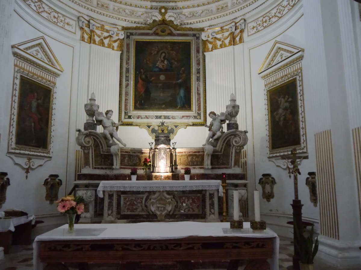 „In dieser Kirche ruhen die Gebeine der Familien Peralta und Luna“ (Cusmano). Altäre und Fußböden sind alle aus rotem Marmor aus Sciacca. In der Kirche befindet sich auch eine Grabtafel der Ordensschwestern, obwohl diese in der Grabstätte innerhalb des Klosters beigesetzt sind. Die mit Feingold verzierten Jalousien sind ein Werk der Brüder Salvatore und Vincenzo Cannella aus Sciacca. .