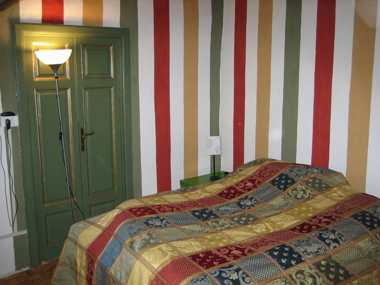 Ein Schlafzimmer ist in den Farben weiß, gelb, rot und grün gestrichen. Das Schlafzimmer darunter ist in rot / weiß gehalten. Hier befindet sich auch ein weiteres kleines Bad, allerdings ohne Dusche.